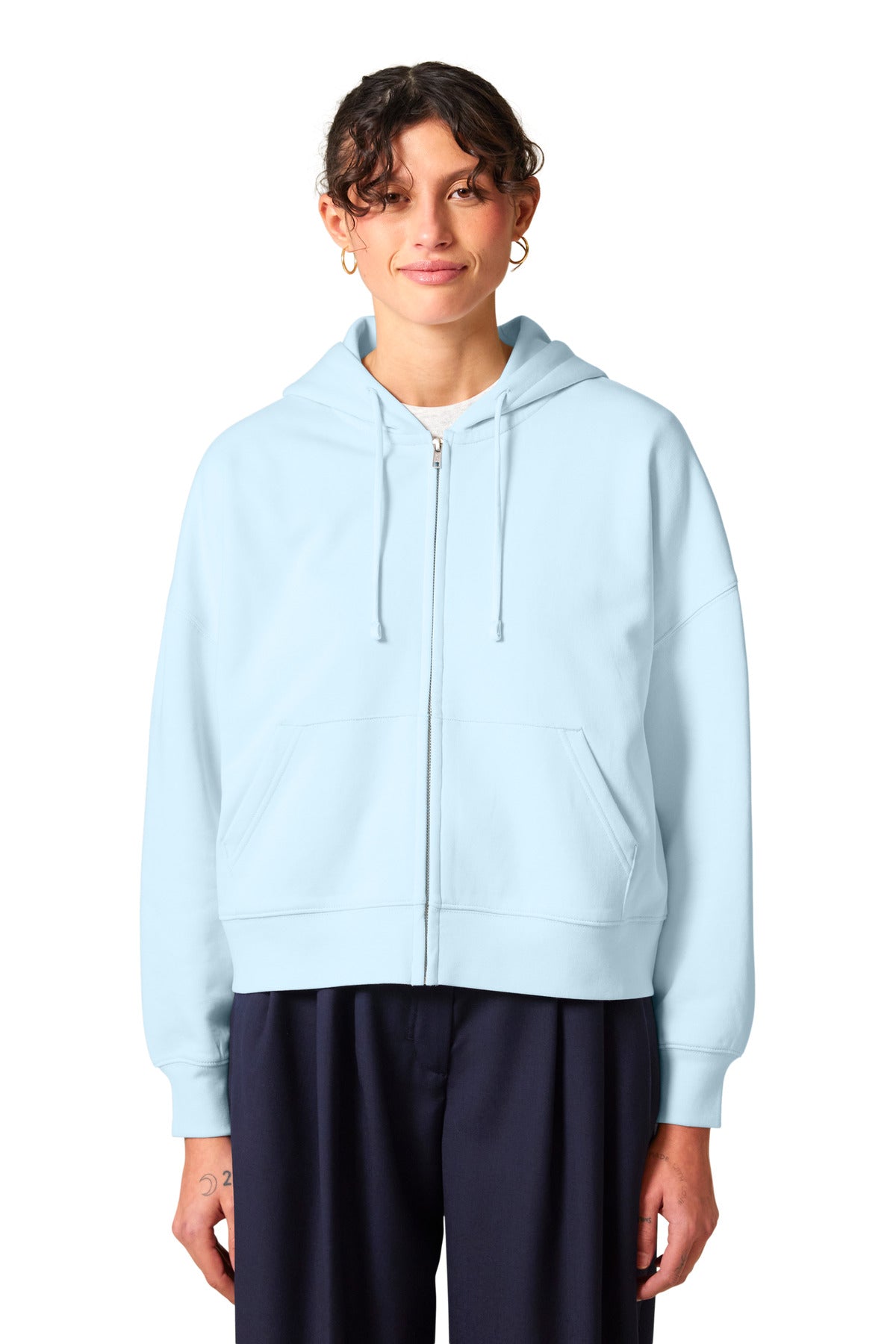 A flattering zipped hoodie with contemporary flair. An adjusted length and refined details add a feminine touch to this sustainably-made sweatshirt. 8.9-ounce (300-gram) 80% organic combed ring spun cotton/20% recycled polyester brushed 3-end fleece cotton face Self-fabric double-layer hood Dyed-to-match flat drawcords Embroidered eyelets Dropped shoulders 1x1 rib knit cuffs and hem Covered center front metal zipper Double-needle topstitch on all seams Front pouch pockets with flat topstitch Medium fit 100% recycled polyester tear-away label