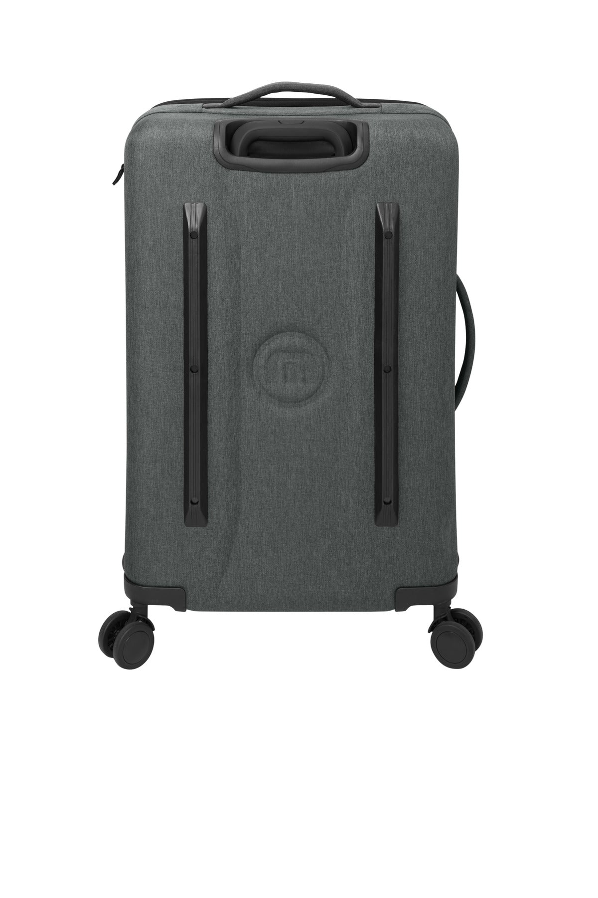 Ready set check! Cruise through any excursion equipped with this spinner that's roomy and all just for you. 600D poly Durable water repellent (DWR) finish Molded back with embossed TM logo Padded top handle for quick grab and easy lifting Zippered front pocket can be removed for ease of decoration Large main compartments with compression straps Padded side grab handle 4 spinning wheels for easy maneuvering and increased stability Locking retractable handle Rubberized TM logo Dimensions: 27.5 h x 17 w x 9.5 d Capacity: 3 478 cu. in./57 L Weight: 8.07 lbs./3.66 kgNote: Bags not intended for use by children 12 and under.